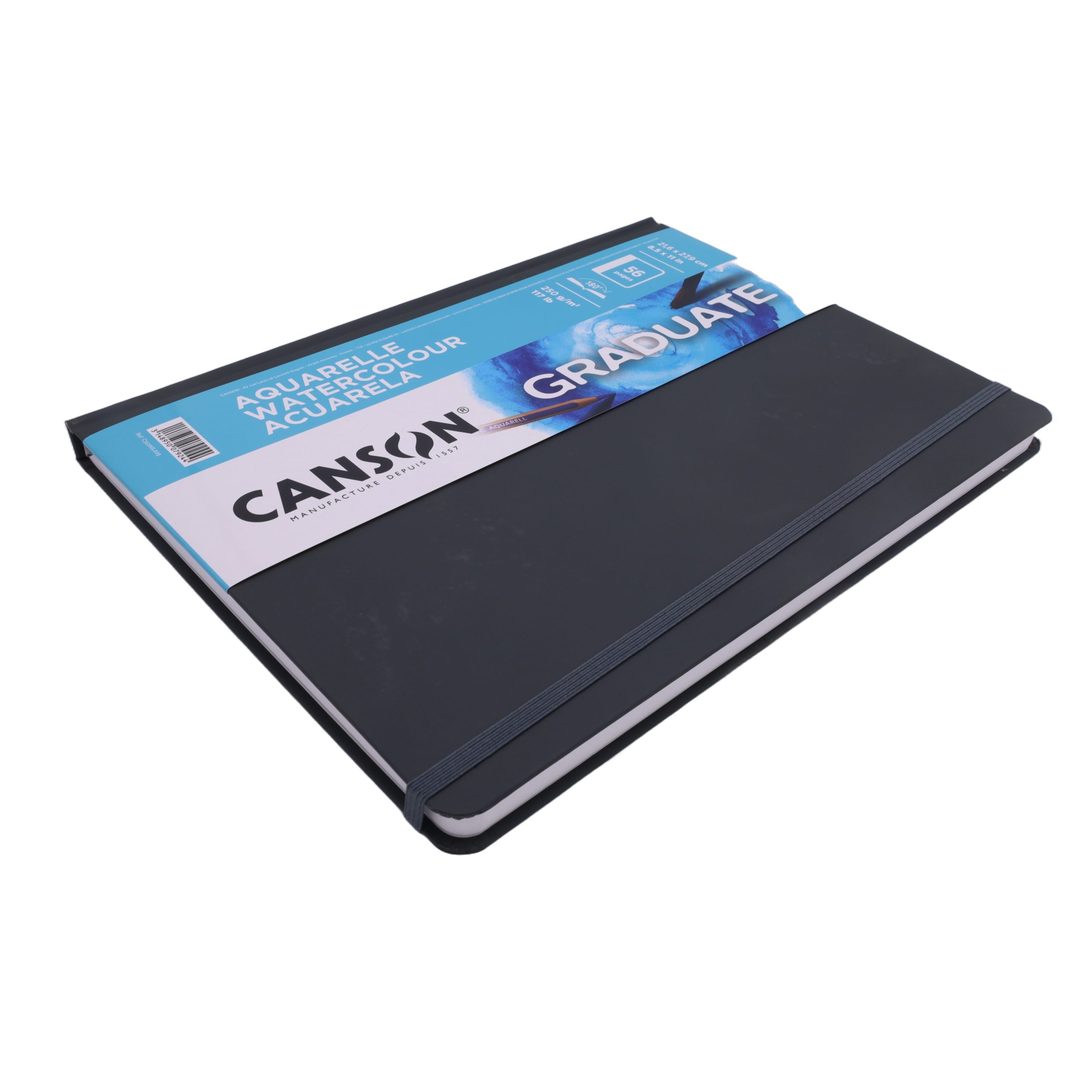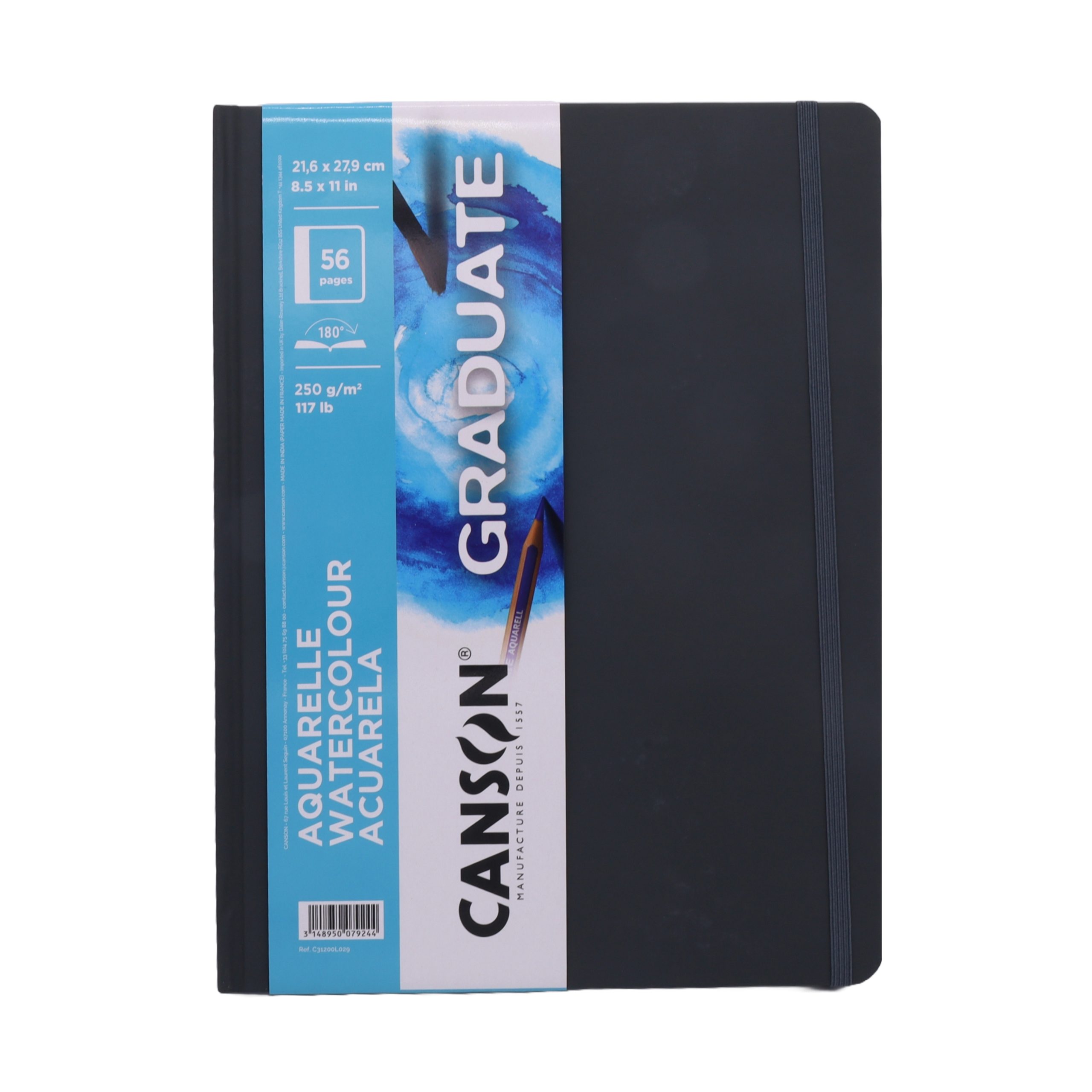 The Canson Graduate Watercolour Pad in 8.5″ × 11″ (21.6 × 27.9 cm) format features a durable soft‑touch hardback cover and stitched binding along the long edge.